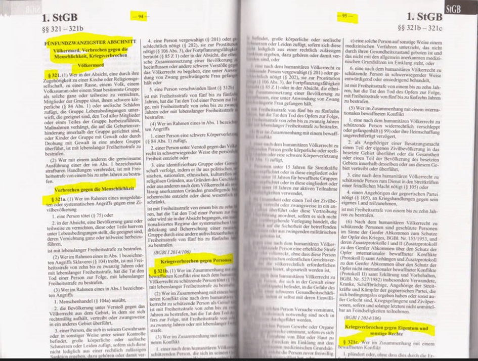 StGB Funfundzwanzigster Abschnitt: Kriegsverbrechen, Verbrechen gegen die Menschlichkeit, Völkermord https://www.jusline.at/gesetz/stgb/paragraf/321e