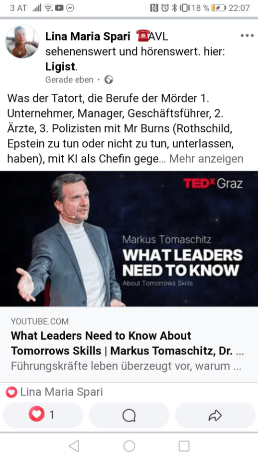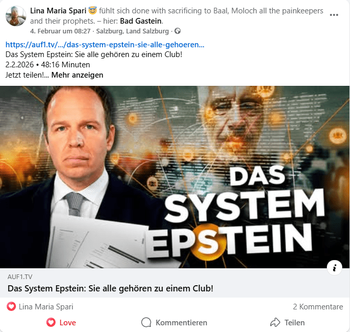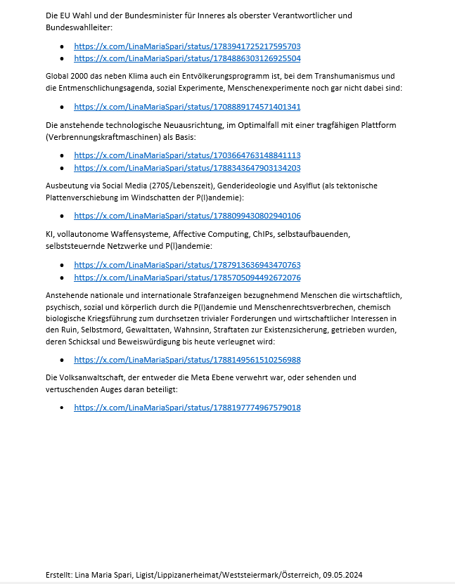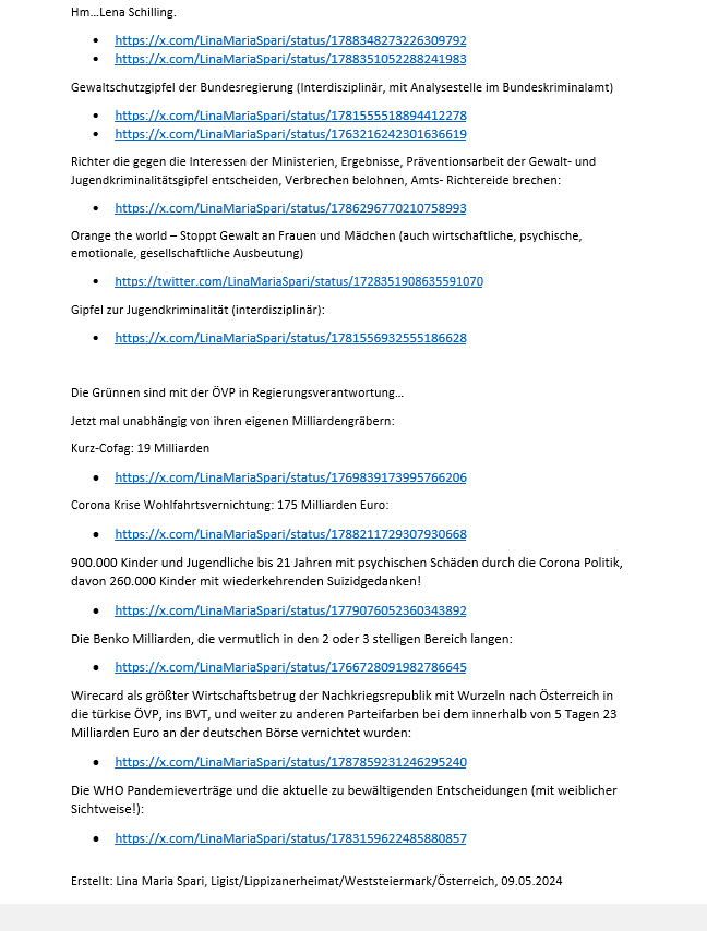 Anm Lina Maria Spari, 11 Feber 2026, 08:15: Die Linkvorschau von X, Youtube und Webseite Links funktioniert „plötzlich“ nicht mehr. Vor 20 Minuten noch alles OK (nach einfügen vom Magnet Epstein Bericht, und dem Kendler Experiment Bericht, der staatlich finanzierten Kindesabnahme); im Bearbeiten Status ist alles sichtbar. Im Finish Modus, Webseite ansehen, „Webseite Online“ nicht. Hinzu kommt, dass im Ansehen Modus, also „Webseite online“ die X Links als Twitter Links angezeigt werden, da offensichtlich ein Schaltvorgang statt gefunden hat. NoGo. Ende. 08:20 AM MEWZ, Ligist. Ende.