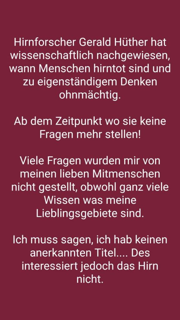 Prof. Gerald Hüther über Beziehungen und andere nicht zum Objekt zu machen; in die Haltung zu kommen nicht immer nur was von anderen Haben zu Wollen, sondern auch etwas schenken zu können; wie Liebe und Verbundenheit aufs Gehirn wirkt und auf Potentialentfaltung. Und über Digitalisierung, und dass sie solange sie Werkzeug ist und als Werkzeug benutzt wird um ein Werk zu vollbringen kein Problem ist, jedoch zur potentiellen Gefahr wird, wenn sie als Ersatzbefriedung und Affektregulation (Langeweile, Bedürfnisse, Sehnsüchte) benutzt wird, wenn Menschen sich ihre Bedürfnisse nicht mehr im realen Leben erfüllen. Wer die Geräte nutzt um seine Bedürfnisse in einer virtuellen Welt zu stillen und nicht im echten Leben, kann in dieser Zeit sich nicht im echten Leben um Freunde kümmern oder ein Werk vollbringen…und das wissen die Hersteller und die Wirtschaft und das nutzen sie aus…auch hier geht es darum sich zu emanzipieren.
