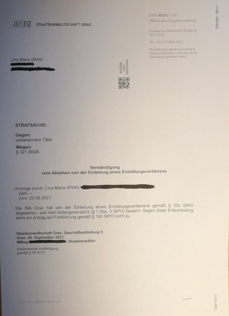 Am 14.09.2021 wurde ich darüber informiert, dass die Staatsanwaltschaft Graz unter 6 OStA 466/21b, meine bei der Oberstaatsanwaltschaft Graz eingebrachten E-Mail-Eingaben vom 31. August 2021 entgegengenommen hat.