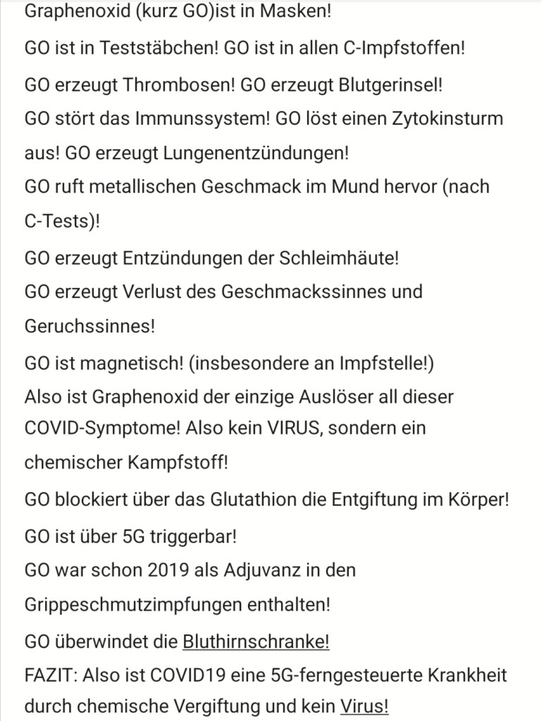 Sie sind jetzt keine Personen mehr, sondern GVOs.. gentechnisch veränderte Dinge!!! durch eine Quantenverbindung pulsierender Mikrowellenfrequenzen von 2,4 GHz oder höher von Mobilfunkmasten und Satelliten direkt zum Graphenoxid, welches sich im Fettgewebe aller Personen , die den chemischen Schuss erhalten haben, befindet