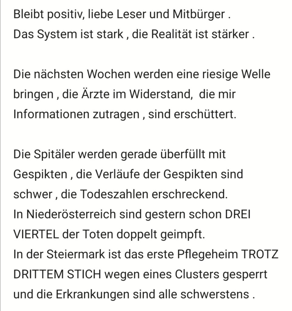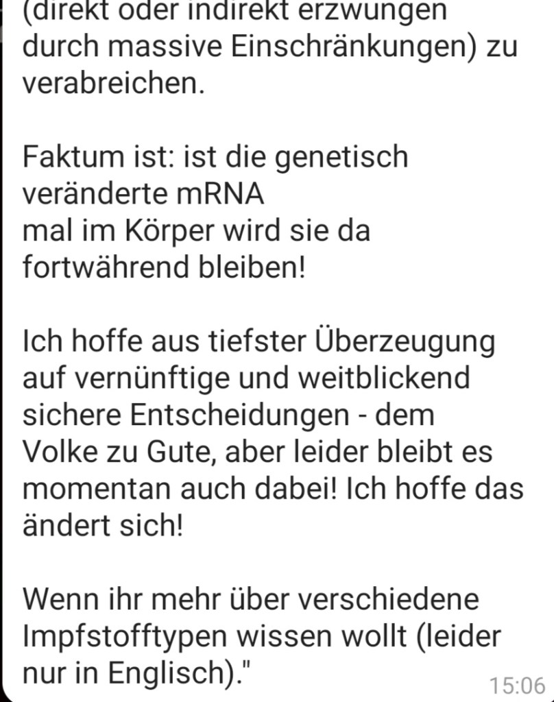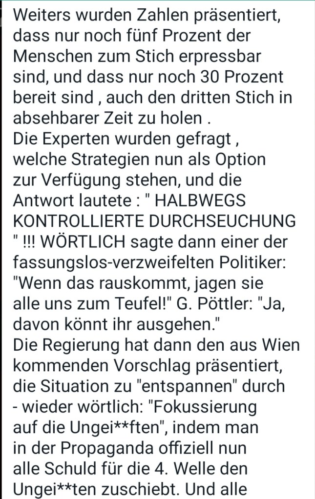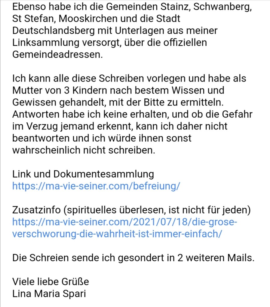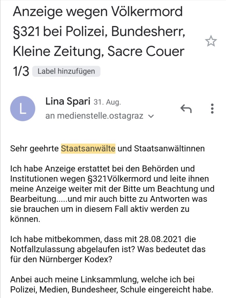 Alle Dokumente Netzfund! Anzeigen an Polizei, Bundesheer und Medien wegen §321 Völkermord wurden eingereicht und weitergeleitet. Ebenso wurden die Unterlagen und Informationen und Dokumente an die Bürgermeister 5 einzelner Gemeinden (Mooskirchen, St. Stefan ob Staniz, Stainz, Deutschlandsberg, Schwanberg nach dem 28.08.21 am 18.09.21 (Sammelverteiler kann auf Wunsch vorgelegt werden) in der südwestlichen Steiermark erweitert und aktualisiert weitergegeben.