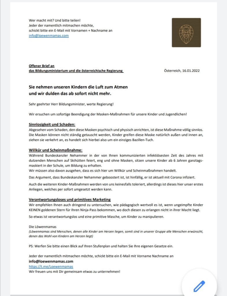 Unter untenstehenden Link findet ihr ein fertiges „Anschreiben“ und ein ausführliches Begleitschreiben mit detaillierten Daten und Quellen zum Versenden an Direktoren, Lehrer, Ärzte, Journalisten, Freunde, etc…